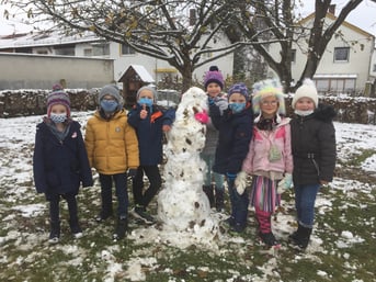 Endlich war es soweit, der Pausenhof verwandelte sich in der Nacht vom 28. auf den 29. November in ein kleines Schneeparadies. Auch wenn der Schnee leider nicht lange liegen blieb, nutzen die Kinder der Klasse 1a die Gelegenheit und bauten gemeinsam tolle Schneemänner.