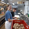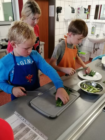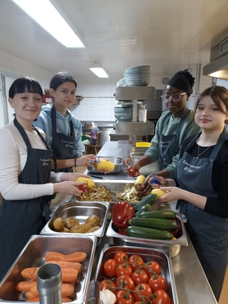 Zu Beginn der Projekttage wurde die Gruppe in ein Küchen- und Serviceteam aufgeteilt. Das Küchenteam bereitete ein köstliches 3-Gänge-Menü zu. Die Menüauswahl umfasste eine Karotten-Ingwer-Suppe als Vorspeise, gegrilltes Hähnchenfilet auf mediterranem Gemüse mit Kartoffeln als Hauptgang und zum Abschluss einen Kaiserschmarrn mit Apfelkompott.