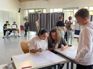 Unsere Aula wurde am 29.9.2023 in ein Wahllokal verwandelt. Die fleißigen Wahlhelfer der Klasse 7a unter der Leitung von Frau Obermeier wies die gesamten Schüler*innen der Mittelschule in den Wahlverlauf ein, hakte jeden Einzelnen auf Listen ab und bewachten die originalen Wahlkabinen, die Herr Eisenschink dankenswerterweise aufstellte. Die selben Wahlkabinen werden auch für die Landtags- und Bezirkstagswahlen am 8.10. verwendet.