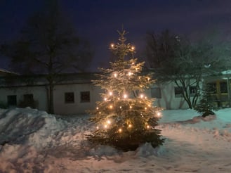 Er leuchtet wieder - der Weihnachtsbaum der Comeniusschulen vor dem Haupteingang, der von Schülerinnen und Schülern zum Erstrahlen gebracht wurde und die Winterlandschaft in ein fast gemütliches Licht taucht.