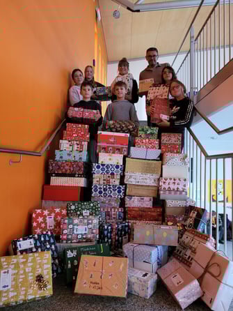 Die Hilfsorganisation humedica arbeitet auf Hochtouren, um im Aktionszeitraum Weihnachtsgeschenke entgegenzunehmen und bedürftigen Kindern hauptsächlich in Osteuropa eine ganz besondere Freude zu bereiten. Und so haben die Comeniusschulen, wie auch all die letzten Jahre, die Aktion „Geschenk mit Herz“ mit viel Engagement unterstützt. „Geschenk mit Herz“ verbindet Kinder und deren Familien aus Deutschland mit bedürftigen Kindern weltweit. Viele Kinder dieser Welt leben in Armut, Krieg und Ungerechtigkeit, ohne jegliche Perspektive und Schutz.Unsere Schüler*innen befüllten Schuhkartons mit Geschenken für Mädchen und Jungs verschiedener Altersgruppen: Kuscheltiere, Süßigkeiten, Spiele, Kleidungsstücke, Schreibwaren, Malsachen, Puzzles, Hygieneartikel und vieles mehr. Anschließend wurden die Kartons liebevoll mit Geschenkpapier verpackt und verschnürt. Grußkarten wurden gestaltet und mit beigelegt. Die Päckchen wurden dann in der Schule gesammelt und am Dienstag von ehrenamtlichen Fahrern abgeholt. Sie werden dann in die osteuropäischen Zielländer, wie Rumänien oder auch Moldawien gebracht. Hier erhalten viele Kinder ihr erstes richtiges Weihnachtsgeschenk. Insgesamt sammelten die Schüler*Innen rund 80 Päckchen.
