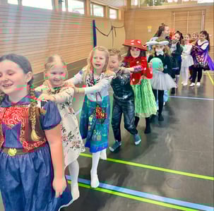 Am Unsinnigen Donnerstag feierten die Klassen 2a und 2b eine fröhliche Faschingsparty. Los ging es in der Turnhalle, wo die Kinder bei lustigen Spielen wie „Reise nach Jerusalem“ und „Luftballontanz“ viel Spaß hatten. In ihren bunten Kostümen gaben sie alles und lachten ausgelassen.