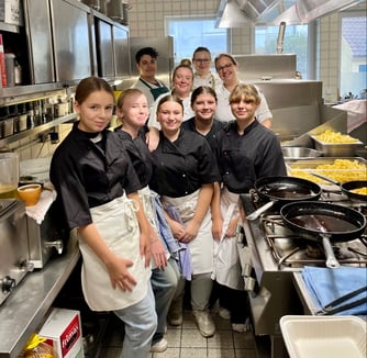 Die Jungs und Mädchen durften in der Küche selbst anpacken und unter Anleitung der Profis ein 3-Gänge-Menü zubereiten. Fachbegriffe wie die drei P`s wurden umgesetzt: Fleisch parieren, plattieren, panieren – so bereitet man fachgerecht panierte Schnitzel zu. Nicht zwei bis vier, wie in üblichen Haushalten, sondern 80 – 100 Stück und das musste alles bis zur Ankunft der Gäste erledigt werden. Jedes Essen muss heiß und frisch über den Pass gehen. Daher kann es teils schon etwas stressig werden. Doch eine gute Vorbereitung und Erfahrung beweist, dass in einem eingespielten Team gar kein Stress aufkommen muss.